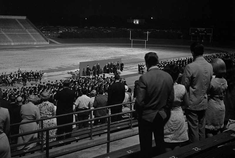 August 1956: Fouts Field hosted its first commencement ceremony. The stadium continued to serve as a graduation venue off and on, especially for summer ceremonies, until the UNT Coliseum was built in 1973.