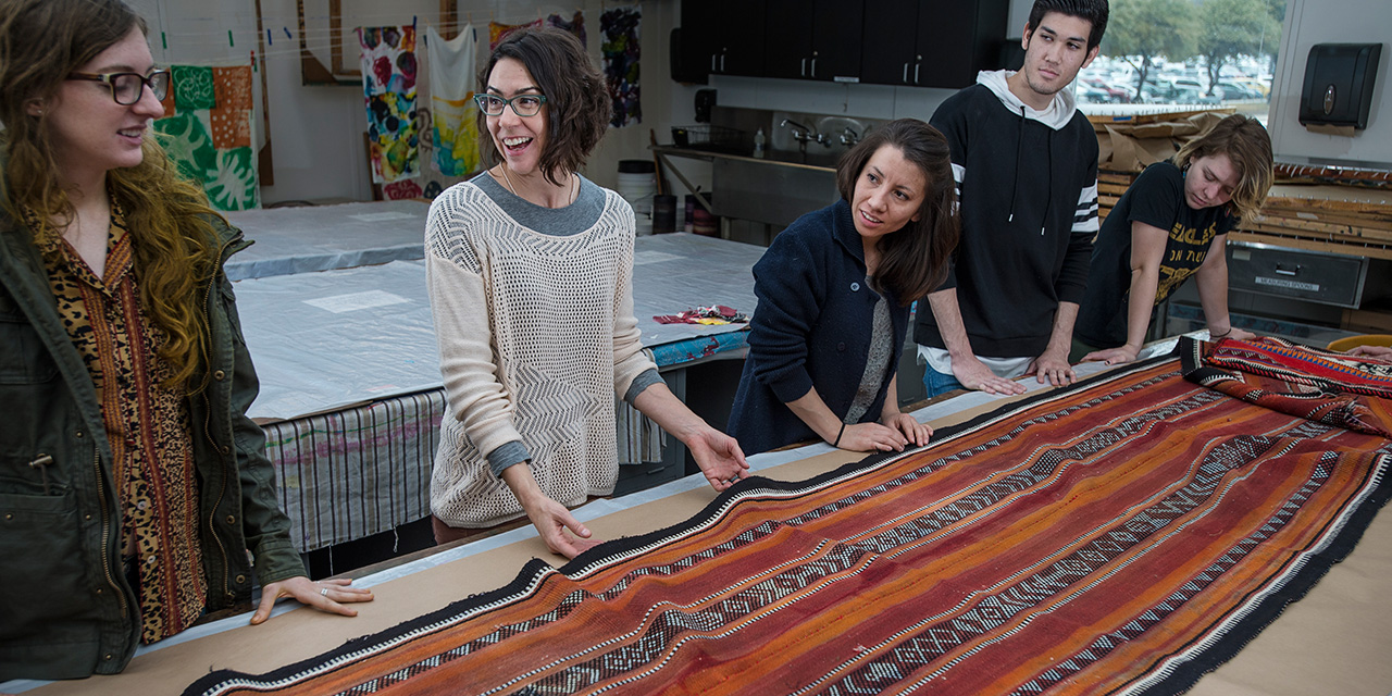 Robertson's students have already started collaborations from afar. Junior Michelle Salazar and senior Abby Hudson, both fibers majors, were able to work with Robertson on a 25-foot floor loom prototype for the next step in the collaboration with Al Sadu House. Robertson is proposing an interactive exhibition that will involve artists, students, and community members in Kuwait and the U.S. The Al Sadu House weavers use traditional ground looms that are modified for use indoors. This proposal involves creating an interactive loom that will be designed to promote the awareness of sadu weaving, engage the community in the textile arts and promote cultural exchange.